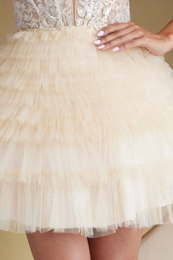 Deep V Neck Halter Neckline Ruffle Skirt Cocktail Dress. Embroidery, Sequin Detail, Illusion Design, Zipper Closure.
