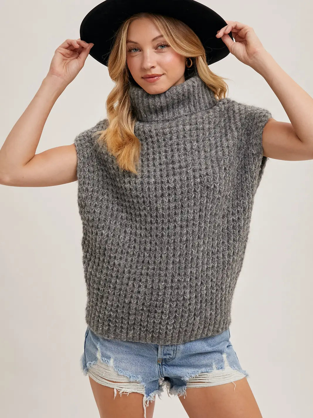 Turtleneck Waffle Knit Vest Sweater-Charcoal